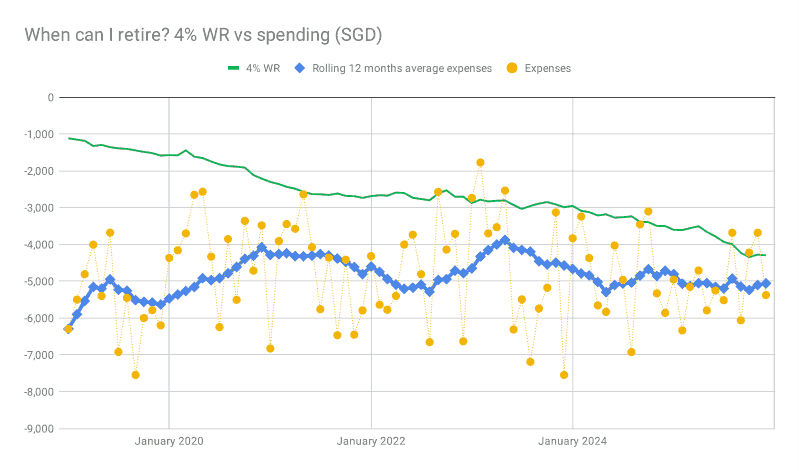 Once the green and blue lines intersect, I could retire even at my current spending level. Since most of my expenses are discretionary rather than essential, it would likely be possible to retire even today.